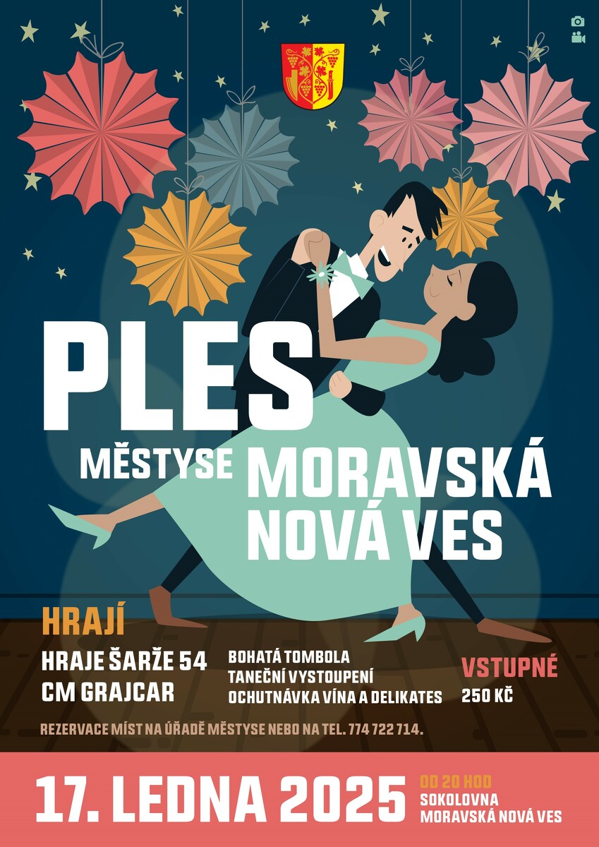 - Zveme Vás na Ples městyse Typ: JPG obrázek, Velikost: 196.32 kB, který se koná v pátek 17.1.2025 od 20 h v místní sokolovně. Hraje kapela Šarže 54 a CM Grajcar. Připravena je bohatá tombola, taneční vystoupení, košt vína a delikates k vínu. Vstupenka je za 250,- Kč. Místa u stolu můžete zarezervovat na úřadě městyse u paní Frýdkové nebo na tel. 774 722 714.