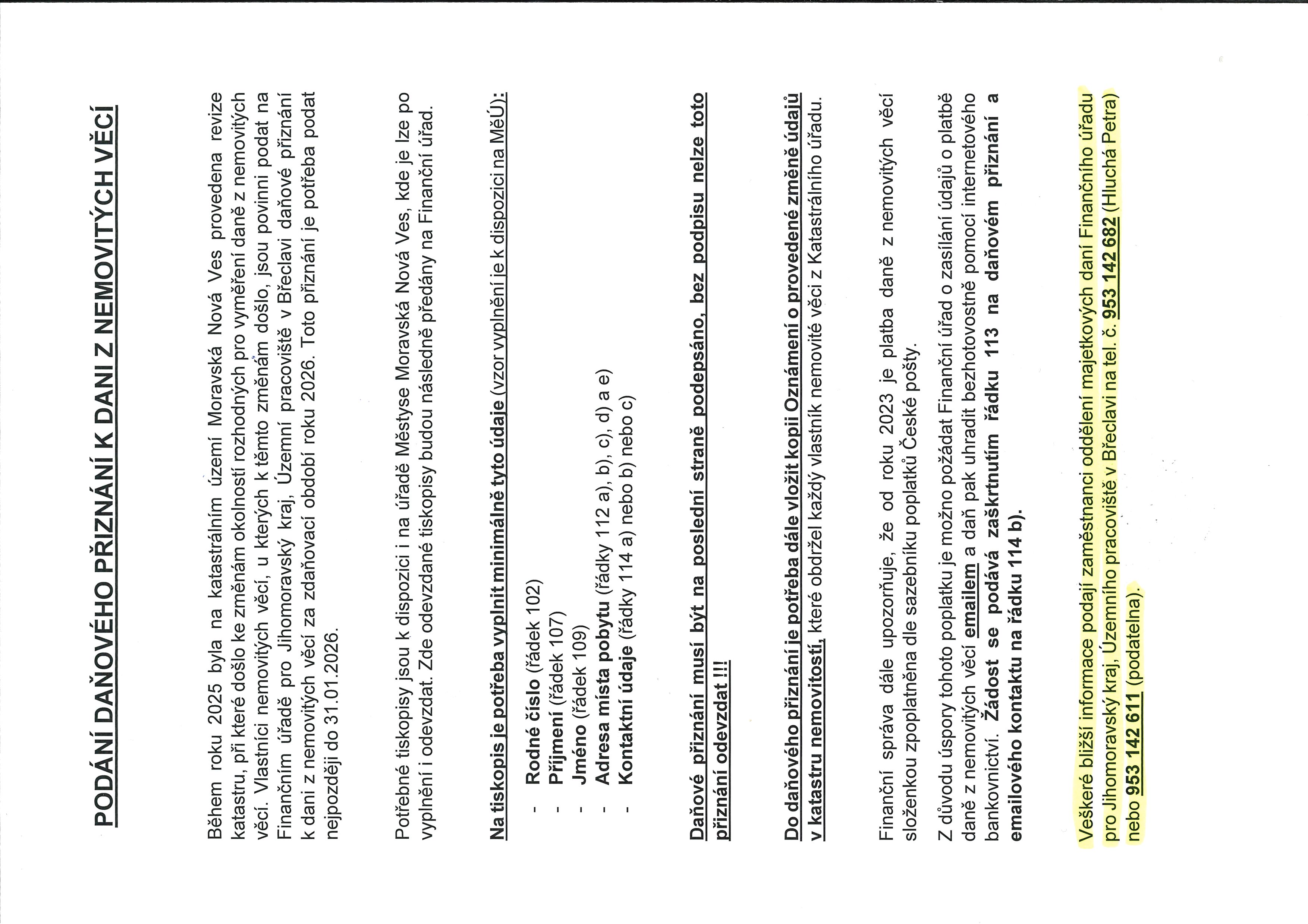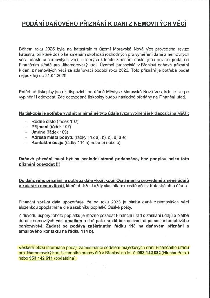 - Finanční úřad pro Jihomoravský kraj, Územní pracoviště v Břeclavi oznamuje, že v naší obci proběhla v loňském roce revize katastru. Došlo tudíž ke změnám okolností rozhodných pro stanovení daňové povinnosti u daně z nemovitých věcí a dotčení vlastníci jsou povinni podat daňové přiznání na zdaňovací období roku 2026. Toto daňové přiznání je potřeba podat do konce ledna 2026 na Územním pracovišti v Břeclavi, případně si vyzvednout a odevzdat tiskopis v úředních hodinách na podatelně úřadu městyse. Veškeré bližší informace podají zaměstnanci oddělení majetkových daní Finančního úřadu v Břeclavi na tel. č. 953 142 682 (Hluchá Petra) nebo 953 142 611 (podatelna). Úřad městyse pouze zprostředkovává výdej a sběr těchto tiskopisů.