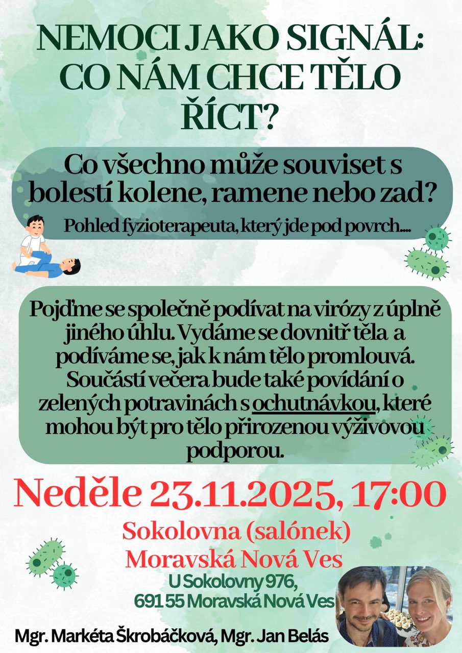 - Rodinný klub Brouček zve na přednášku „Nemoci jako signál: Co nám chce tělo říct?“ s fyzioterapeutem Janem Belásem a Markétou Škrobáčkovou. Dozvíte se, co všechno může souviset s bolestí ramene, kolene či zad a jak tělo podpořit přirozenou výživou. Přednáška se koná v neděli 23. listopadu 2025 v 17 hodin v salonku Sokolovny. Vstup je ZDARMA. Přijďte se inspirovat!