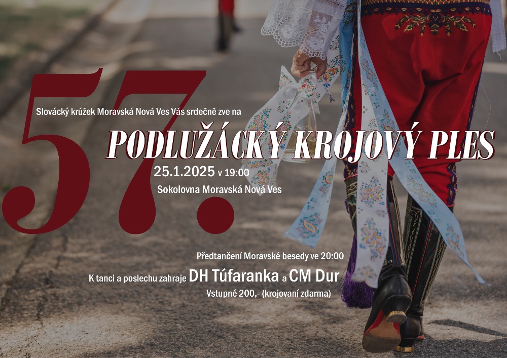 - Slovácký krúžek Vás zve na Podlužácký krojový ples Typ: JPG obrázek, Velikost: 199.5 kB, který se koná v sobotu 25.1.2025 od 19 h na sokolovně. Předtančení je Moravskou besedou ve 20 h. Hraje DH Túfaranka a CM Dur. Vstupné je 200,- Kč.