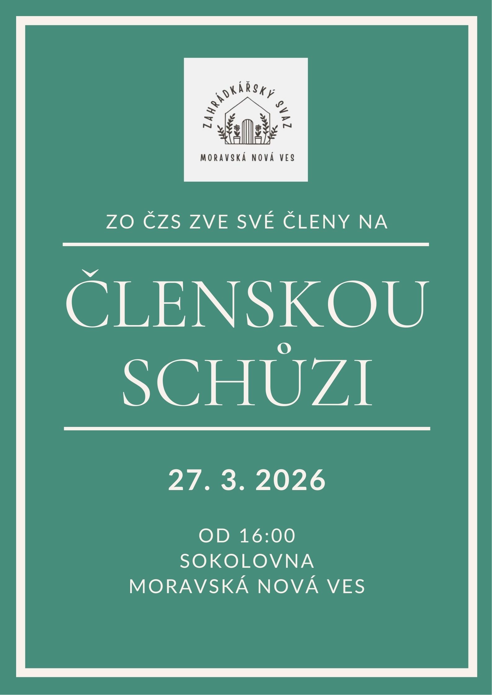 - Místní organizace českého zahrádkářského svazu zve své členy na členy na členskou schůzi, která se koná v prostorách sokolovny v pátek 27. března v 16 hodin. Těšíme se na vaši účast.