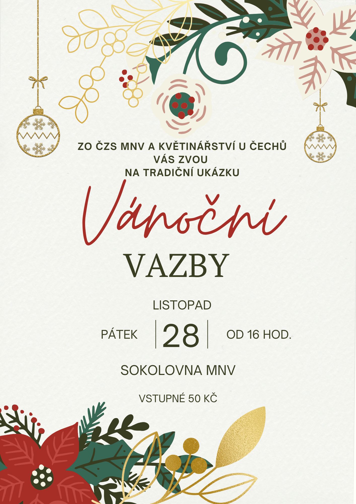 - ZO ČZS MNV a Květinářství U Čechů Vás zvou v pátek 28. listopadu od 16 h. na sokolovnu na tradiční ukázku vánoční vazby. Vstupné je 50,-Kč