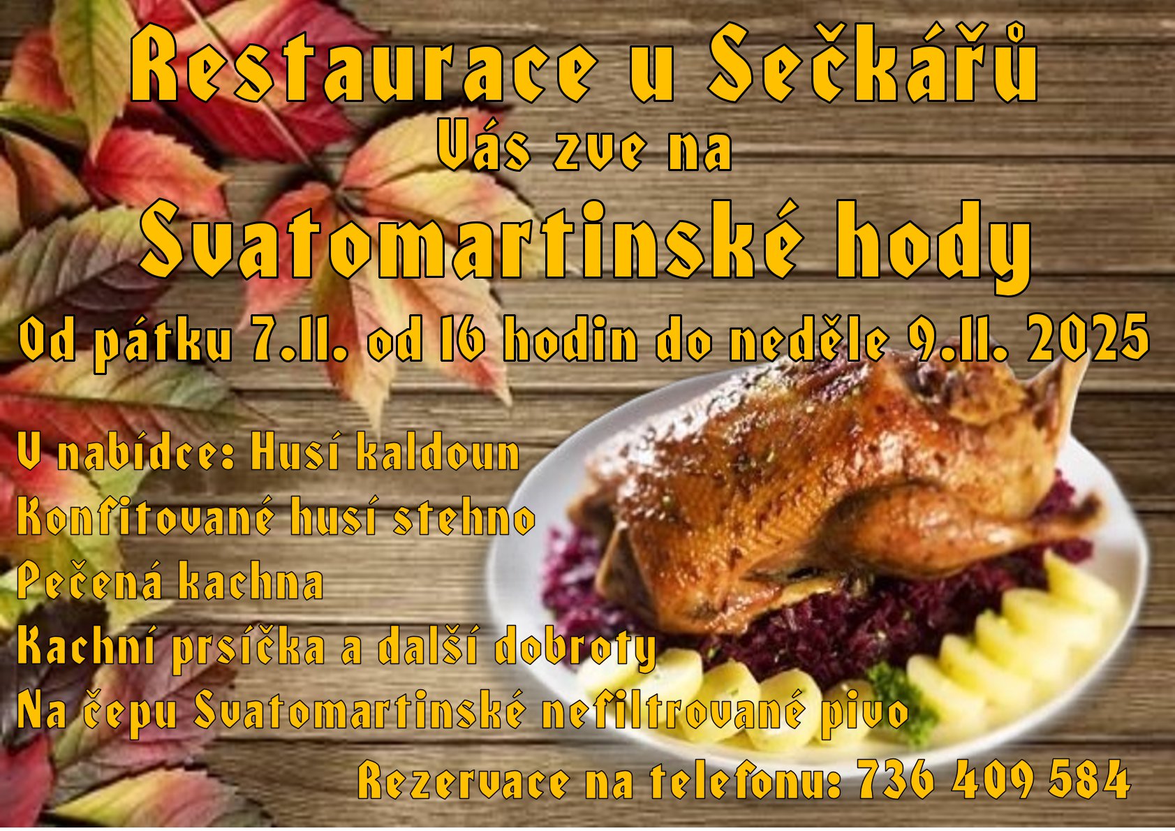 - Restaurace u Sečkářů Vás zve na Svatomartinské hody, které se konají od pátku 7.11. od 16 h do neděle 9.11. V nabídce budou husí a kachní speciality a na čepu Svatomartinské nefiltrované pivo. Rezervace míst na tel. 736 409 584.