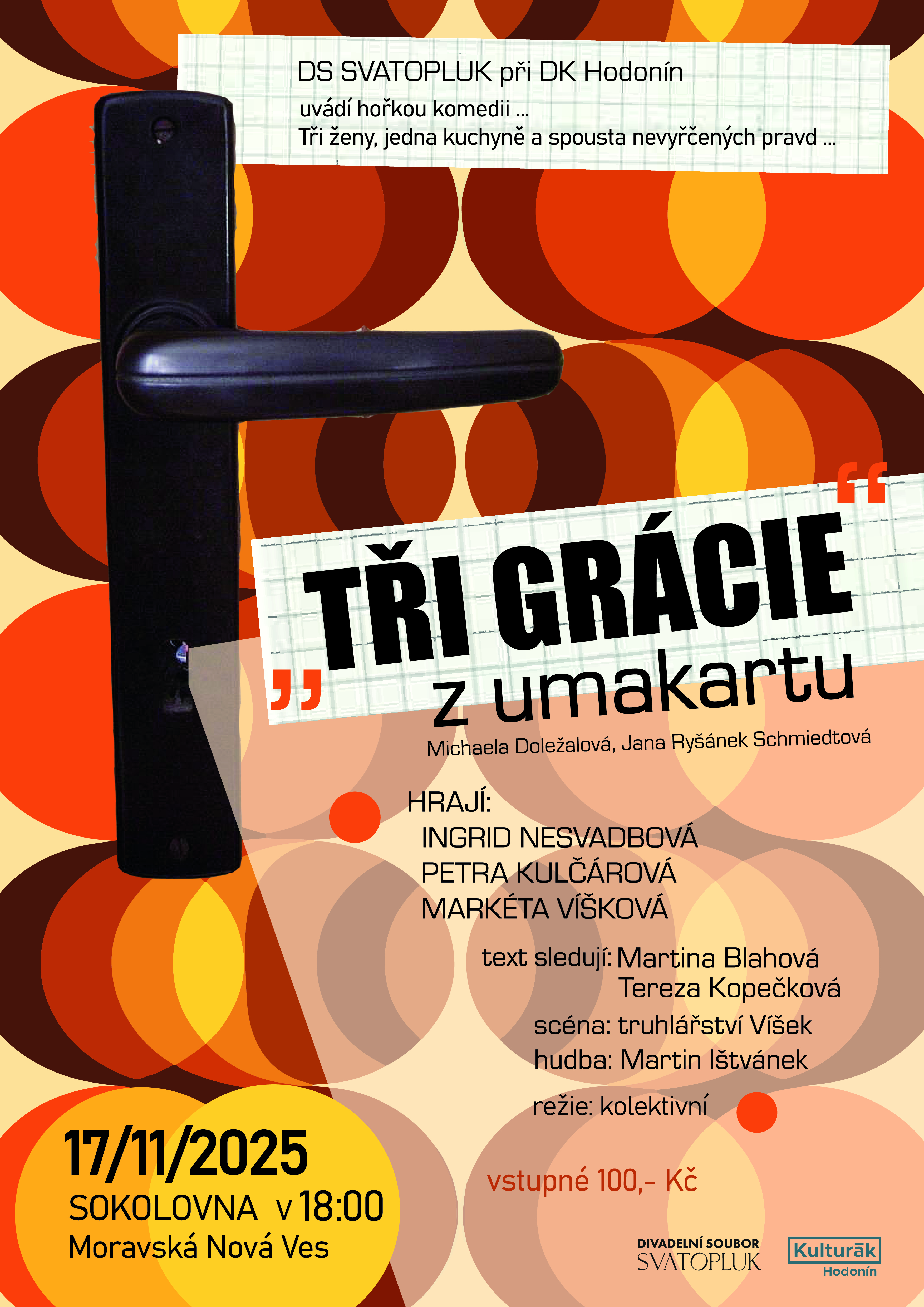 - Zveme Vás na divadelní představení divadelního spolku Svatopluk z Hodonína, který uvede hořkou komedii Tři grácie z umakartu. Představení se koná v pondělí 17. 11. od 18:00 hodin v místní sokolovně. Vstupné 100 Kč.