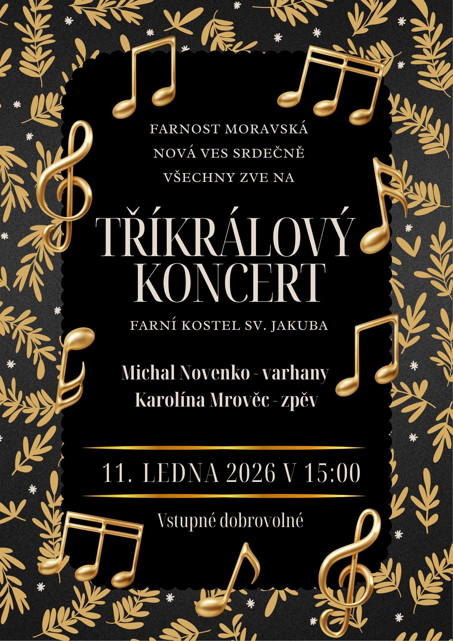 - Farnost Moravská Nová Ves Vás zve na Tříkrálový koncert, který se koná 11. ledna 2026 od 15 hodin v kostele sv. Jakuba. Vystoupí Michal Novenko a Karolína Mrověc. Vstupné je dobrovolné.